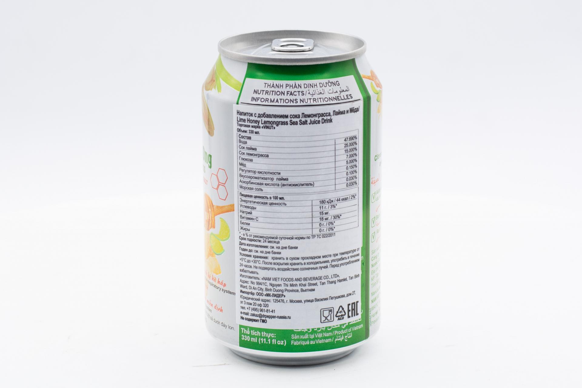 Напиток сокосодержащий Vinut Лемонграсс, Лайм и Мёд 330 мл ж/б0,00 руб. за штуку (в упак. 24 шт.) |